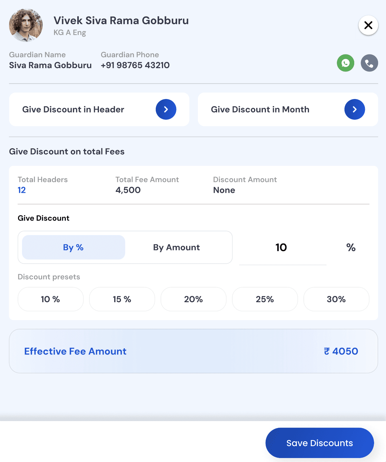 A particular fee header is given discount by %, amount or disabled completely.